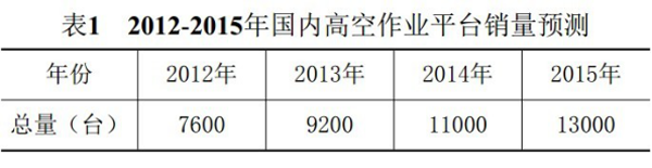 从工程机械结构升级和全球高端装备制造的转移趋势来看,我国高空作业平台行业在“十二五”期间前景广阔;同时,我国经济水平的提高和城市化进程的深入,也使得高空作业平台将面临巨大的市场需求。工信部装备工业司和中国工程机械工业协会联合发布的《中国工程机械行业“十二五”发展规划》中,自行式高空作业平台被列为“十二五”期间重点支持研发生产的新产品。住房和城乡建设部发布的《建筑业“十二五”发展规划》也要求“十二五”期间安全生产形势保持稳定好转,到2015年,房屋建筑和市政工程生产安全事故死亡人数比2010年下降11%以上,鼓励有能力的企业进一步提高施工机械化水平。这都对高空作业平台行业的发展形成了有力推动。以工程机械行业中成熟产品的发展经验判断,我国高空作业平台行业作为正处于上升期的子行业,在未来5年内有望保持20%以上的增速,预计到2015年国内市场容量将达到13000台左右。